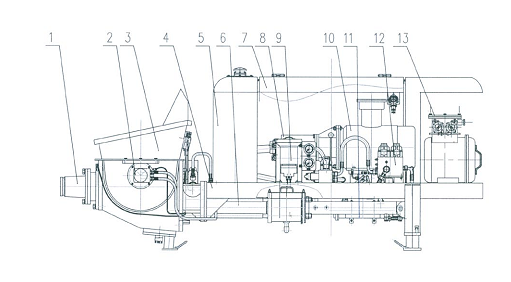 1.出料口 2.攪拌機構 3.料斗 4.機架 5.液壓油箱 6.泵送系統(tǒng) 7.機罩總成 8.潤滑系統(tǒng) 9.動力系統(tǒng) 10.防暴電動機 11.液壓系統(tǒng) 12.水冷卻部件 13.電器總成