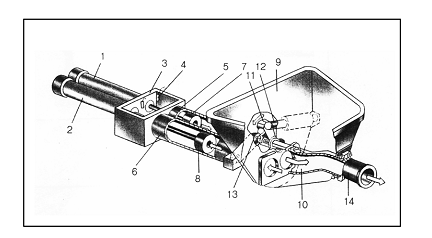 1)(2)主油缸  (3)水箱  (4)換向裝置  (5)(6)混凝土缸 (7)(8)混凝土活塞  (9)料斗 (10)分配閥 (11)擺臂  (12)(13)擺動油缸  (14)出料口