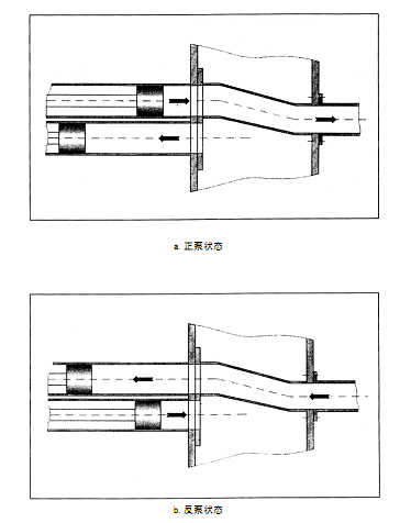 當混凝土活塞8后退至行程終端時,觸發(fā)水箱3中的換向裝置4,主油缸1、2換向,同時擺動油缸1213換向,使分配閥10與混凝土缸6連通,混凝土缸5與料斗連通,這時活塞7后退,8前進。如此循環(huán),從而實現(xiàn)連續(xù)泵送。反泵時,通過反泵操作,使處在吸入行程的混凝土缸與分配閥連通,處在推送行程的混凝土缸與料斗連通,從而將管路中的混凝土抽回料斗(如圖所示)